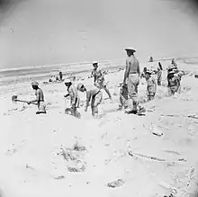 ![]() Britisk infanteri, der bemander en forsvarsstilling beklædt med sandsække nær el-Alamein, 17. juli 1942 |