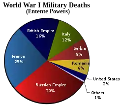 Første Verdenskrig blev i begyndelsen hovedsageligt ført mellem Centralmagterne, det Tyske kejserrige og Østrig-Ungarn, på den ene side og Ententemagterne, Frankrig, Det Russiske Kejserrige, Serbien og Storbritannien på den anden side. Også styrker fra det britiske imperium, bl.a. Canada, deltog. Belgien blev på grund af et tysk angreb presset ind i alliancen mod Centralmagterne, en alliance som også USA (1917), Kongeriget Italien (1915), Rumænien (1916) og flere andre lande senere tiltrådte. Krigen endte med Centralmagternes nederlag og blev endelig formelt afsluttet ved indgåelsen af Versaillestraktaten i sommeren 1919, som pålagde Tyskland skylden for krigen og dermed krigsskadeserstatninger til især Frankrig.
