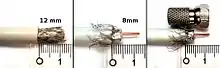På F-hanstikket til højre ses to ringe om mønsteret. Så dette stik passer til koaksialkabler på 5,0 mm – 5,2 mm i diameter.