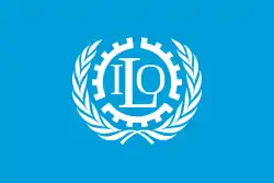 ILO | International Labour Organization | Beholder olivengrenene, men verdenskortet er erstattet med et tandhjul. I midten er organisationens initialer. |