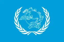 WMO | World Meteorological Organization | Beholder det normale design, men med en gylden kompasrose. Tidligere havde flaget organisationens initialer oven på kompasrosen som var i hvid i stedet for guld. |