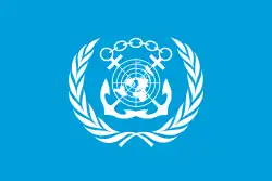 IMO | International Maritime Organization | Anvender en mindre version af verdenskortet med to krydsede ankre placeret bagved. |