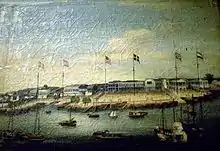 Faktorier i Kanton, ca. 1780. Dannebrog til venstre markerer det danske faktori.