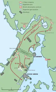 Den 28. maj indtog 450 britiske faldskærmstropper Darwin og Goose Green efter en række hårde kampe, hvor 17 britiske og 55 argentinske soldater blev dræbt. Briterne tog 1.536 argentinske soldater til fange. BBC World Service annoncerede invasionen af Goose Green, før den gik i gang.[11] Efter de 120 taknemmelige falklænderes modtagelse af de britiske tropper indså mange soldater, at de ikke kun kæmpede for principper, men også for mennesker af kød og blod.[12]