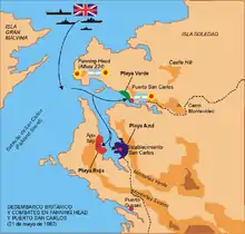 Den 21. maj foretog britiske styrker en amfibielandgang (H-Hour 06:39 UTC) med landsætning af 4.000 mand nær Port San Carlos på den nordlige del af Østfalkland. Planen var herefter at rykke frem sydover og erobre Darwin og Goose Green før slaget om Stanley. Briterne mødte kun let modstand fra de 42 argentinere på stedet, som dog nåede med deres automatrifler at nedskyde to af Royal Marines Gazellehelikoptere.