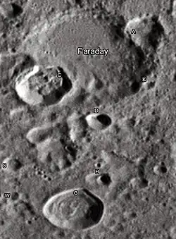 De kratere, som kaldes satellitter, er små kratere beliggende i eller nær hovedkrateret. Deres dannelse er sædvanligvis sket uafhængigt af dette, men de får samme navn som hovedkrateret med tilføjelse af et stort bogstav. På kort over Månen er det en konvention at identificere dem ved at placere dette bogstav på den side af satellitkraterets midte, som ligger nærmest hovedkrateret.[9][10][11] Faradaykrateret har følgende satellitkratere: