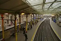 ![]() Vue over stationen fra gangbroen over London Underground-linjerne | |||