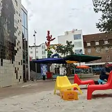 Magasinet, Kulturmaskinen, Odense Internationale Film Festival og Tidens Samling har alle adresse ud til Farvergården. Pladsens nordside afgrænses af Studenterhus Odense, der om sommeren bruger pladsen til strandbar, og på østsiden ligger The Australian Bar.