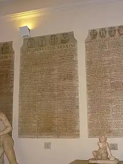 30 fragmenter af Fasti Capitolini blev fundet sammen med 26 fragmenter af Acta Triumphalia eller Fasti Triumphales, der er blevet dateret til samme periode og registrerer navnene på romerske generaler, der var blevet hædret med en triumf. Kardinal Alessandro Farnese (1520 – 1589) bragte dem til Palazzo dei Conservatori på den nærliggende Kapitol-høj, hvor Ligorio og Michelangelo rekonstruerede dem, baseret på observationer fra Panvinio og Ligorio.[10] Yderligere to fragmenter blev opdaget under udgravninger i Forum Romanum i 1817 og 1818.[2] Andre blev opdaget i udgravninger fra 1872 til 1878, med den sidste opdaget i Tiberen i 1888.[11][12]