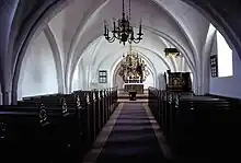 Kor og skib har fået indbygget hvælv i sengotisk tid. I hvælvet har man fundet kalkmalerier og kalkmalede adelsvåben, som blev istandsat i 1886 af Magnus Petersen, i 1962 blev de atter overkalket. Altertavlen er fra o.1650, den brogede staffering er udført af Ernst Trier i 1958.