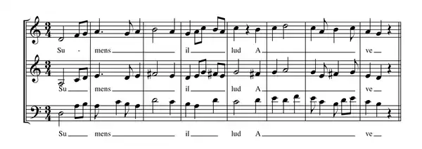 Eksempel på fauxbourdon under åbningen af Guillaume Dufays Ave Maris Stella. I originalen – som ikke er i moderne musiknotation – har den midterste linje påskriften fauxbourdon. Midterstemmen følger øverste stemme en ren kvart under. Nederste linje ligger en del af tiden en sekst under øverste linje og indeholder forsiringer med kadence i oktaven.