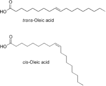 Fedtsyrer med dobbeltbindinger har cis-trans-isomeri. Naturligt forekommende monoumættede og polyumættede fedtsyrer har cis-dobbeltbindinger. Når umættede fedtsyrer hydrogeneres, som det f.eks. sker ved fremstillingen af margarine fra planteolier, dannes der transfedtsyrer som et biprodukt. Disse menes at have ugunstig virkning på helbredet, f.eks. kan de medvirke til at øge kolesterolkoncentrationen i blodet, hvilket kan føre til udvikling af hjerte-kar-sygdomme. Der findes enzymer der kan omdanne en cisforbindelse til den tilsvarende transforbindelse. Disse enzymer kaldes cis-trans-isomeraser.