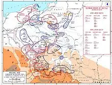De allierede regeringer erklærede krig mod Tyskland den 3. september, men de formåede ikke at yde nogen meningsfuld støtte. På grænsen mellem Tyskland og Frankrig var der nogle få træfninger, selv om hovedparten af de tyske styrker, herunder 85 % af deres panserstyrker var indsat i Polen. Trods nogle polske succeser i mindre grænsekampe, tvang den tekniske, operative og numeriske tyske overlegenhed de polske hære til at trække sig tilbage fra grænserne mod Warszawa og Lwów. Luftwaffe fik luftherredømmet tidligt i kampagnen. Ved at ødelægge kommunikationsmidlerne forøgede Luftwaffe hastigheden i fremrykningen, som overløb polske flyvepladser og luftmeldeposter og afstedkom logistiske problemer for polakkerne. Mange polske flystyrker manglede forsyninger, og 98 fly trak sig tilbage til det dengang neutrale Rumænien.[33] Den oprindelige styrke på 400 var reduceret til blot 54 den 14. september, og modstand i luften var stort set ophørt.[33]
