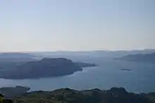 Riksvej 57 krydser fjorden via færgeforbindelsen Leirvåg-Sløvåg.
