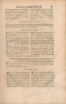 | Cubum autem in duos cubos, aut quadratoquadratum in duos quadratoquadratos, et generaliter nullam in infinitum ultra quadratum potestatem in duos eiusdem nominis fas est dividere cuius rei demonstrationem mirabilem sane detexi. Hanc marginis exiguitas non caperet. | (Det er umuligt at dele en tredjepotens i to tredjepotenser, eller en fjerdepotens i to fjerdepotenser, eller generelt, en vilkårlig potens større end 2 i to af de samme potenser. Jeg har opdaget et ganske bemærkelsesværdigt bevis for dette, som marginen er for smal til at indeholde.) |
