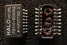 Ferritringkerne eller ferrit-toruskernetransformatorer, som anvendes i et ethernetnetkort til galvanisk isolation og balun.