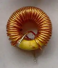 Spolebevikling på en gul farvekodemærket ferritringkerne eller ferrit-toruskerne.