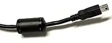 En plastindkapslet ferritkerne ved enden af et USB-kabel.