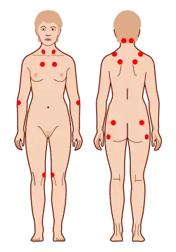 ![]() De ni parrede smertefulde punkter, der almindeligvis anvendes til diagnosticering af fibromyalgi. | |