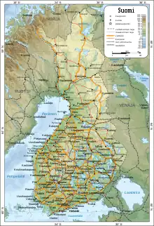Finland grænser på landjorden op til Sverige mod nordvest, Norge mod nord og Rusland mod øst, mens det ligger ud til Botniske Bugt mod vest og Finske Bugt mod syd; begge disse farvande er en del af Østersøen. Grænsen mod Sverige er 540 km, mod Norge 720 km og mod Rusland 1.268 km. Den samlede kystlinje er omtrent 1.107 km, men den er meget ujævn med dybe bugter og vige. Der er desuden store kyststrækninger, ud for hvilke der er skærgård med mange øer og skær.[2]