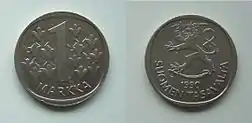 - 1 mark (kobberfarvet) løven fra det finske statsvåben er på bagsiden.