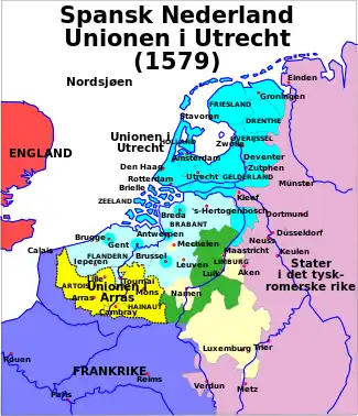 Som et svar på dette blev Unionen i Utrecht undertegnet to uger senere. Her blev Holland, Zeeland, Utrecht, Gelderland og Groningen forenede. To år senere gik også Bruxelles, Antwerpen og Gent ind i unionen. I 1581 blev det vedtaget, at unionen ikke længere ville anerkende den spanske konge som herre, og unionen blev omdannet til republikken De forenede Nederlande.