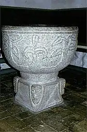 Den romanske døbefont i granit har bladornamentik på kummen og hjørnehoveder på den firesidede fod.