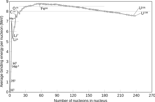 Det betyder at kerner som har en diameter på mere end 12 kernepartikler når til et punkt, hvor den elektrostatiske frastødning overvinder kernekraften og gør kernerne ustabile. Af samme årsag er tungere kerner (mere end 8 kernepartikler i diameter) mindre fast bundet pr. masseenhed end mindre kerner; når en tung kerne brydes op i to eller flere med medium-masse frigøres energi. Oprindelsen til denne energi er kernekraften, som virker mere effektivt i kernerne med medium-masse. Her har hver kernepartikel nemlig mange naboer som er inde for rækkevidde af den kortrækkende kernekraft.