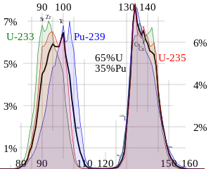 I kernefission kan kernen spaltes til forskellige kombinationer af lettere kerner, det mest almindelige er at der er en opspaltning i to dele med en mindre forskel i masse mellem delene; den ene kerne med en masse på 90 to 100 u og den anden mellem 130 to 140 u.[11] Energimæssigt er den ulige massefordeling en fordel, idet den tillader det ene produkt at være tættere på energi-minimum ved 60 u, mens den anden med masse på 135 u stadigt er tæt på den stærkest bundne kerne.