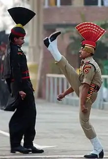 En indisk og en pakistansk soldat afspejler fjendtligheden mellem de to lande ved den eneste grænseovergang i Wagah.