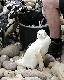 En ung albinistisk æselpingvin (Spheniscus demersus) født i Bristols Zoo. Læg mærke til de rødlige øjne og det helt hvide næb.