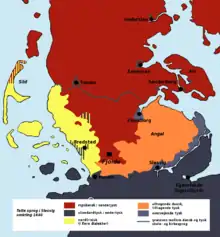 I løbet af 1800-tallet foregik der i de sydlige dele af Slesvig et sprogskifte, hvorved dansk blev afløst af tysk som hverdagssprog. På gesten holdt det danske sprog sig dog lidt længere end i Angel og Svansø [1]. Især i Fjolde Sogn i Nørre Gøs Herred vedblev mange med at tale sønderjysk. Det skyldtes især sognets isolerede beliggenhed på gesten uden for de store byer og handelsveje. Området omkring Fjolde blev dermed efterhånden til en sproglig ø i et tysk-domineret område.