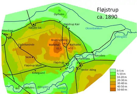 Bakkerne ved Fløjstrup har således været beboet i romersk jernalder, men må sandsynligvis siden være blevet affolket. Rundt om Fløjstrup findes flere bynavne, der ender på -ing (Alling, Fausing, Virring, Hørning), og det viser, at disse byer er grundlagt i germansk jernalder eller tidligere. Derimod viser bynavnet Fløjstrup (betyder Fløjs torp efter mandsnavnet Fløj el.lign.), at denne landsby tidligst er blevet etableret i vikingetiden som en udflytterby.[5] Bosættelsen i Fløjstrup må altså være yngre end germansk jernalder, selvom der i bakkerne har været en boplads i tidlig romersk jernalder. Der er ca. 900 år mellem de yngste tegn på bosættelse i bakkerne (år 100) og det tidspunkt, man formoder de ældste torp-navne stammer fra (år 1000).
