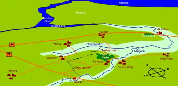 Allingåens forløb havde oprindeligt en slyngning ved Fløjstrup. Omkring 1920 lavede man en uddybning og regulering af åen[7], så et lille engstykke i Fløjstrups ejerlav i dag ligger på den anden side af åen, forbundet med Fløjstrup By ved en lille bro over åen. Åens oprindelige forløb forbi Fløjstrup afsløres stadig af elletræer, hvor åen tidligere lå.