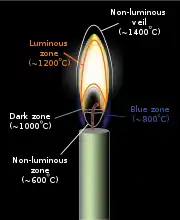 De koldere dele af en flamme med ikke-komplet forbrænding vil være rød gående over mod orange, gul og hvid som temperaturen stiger. Jo tættere flammen er på hvid, jo højere vil temperaturen være.[5] Der opstår alene en blå flamme, når mængden af sod formindskes og emissionen af blåt lys fra de radikale molekyler bliver dominerende; dog kan der i bunden af et stearinlys' flamme ofte ses blåt lys, hvilket skyldes, at koncentrationen af sod på dette sted i flammen er mindre end længere oppe i flammen.[6]