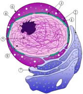 (1) Cellemembranen (2) Ribosomer (3) Kerneporer (4) Kromosomerne (5) Kromatintråde (6) Cellekernen (7) Endoplasmatisk reticulum (8) Nukleoplasma