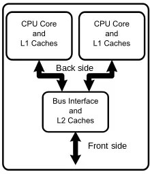 Diagram over en generisk dual-core processor, med CPU-lokal level 1 caches, og en delt, on-chip level 2 cache.