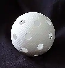 I begyndelsen spillede man med en puk som i ishockey, men det viste sig hurtigt, at den ikke var stort anvendelig på halgulv, hvorfor den blev udskiftet med den runde, hule, hullede bold vi kender i dag. De små fordybninger i bolden, der reducerer luftmodstanden, såvel som friktionen i gulvet, kom først til senere, da man med golfbolden som inspiration ville forsøge at gøre bolden hurtigere og mere præcis.