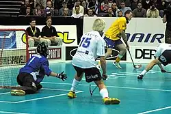 ![]() En floorballkamp mellem Sverige (gul) og Finland (hvid).  | |