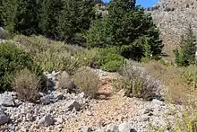 Floraen på Simi, der er en græsk ø i Dodekaneserne tæt på Tyrkiet, er stærkt præget af menneskers virke gennem mindst 3.000 år. De oprindelige skove med Calabrisk Fyr, Kermes-Eg, Oliventræ, Johannesbrød og Græsk Ene er for længst fældet, og jordlaget er udpint eller vasket i havet. De gentagne skovbrande og gedeholdet på øen har forhindret nyopvækst af træer i større målestok, og de nævnte arter ses kun på meget stejle steder, hvor gederne ikke kan nå de unge planter. I stedet er øen præget af dværgbuskheder, de såkaldte frygana, som er en variant af de garriguer, der opstår under tilsvarende betingelser i det vestlige middelhavsområde.