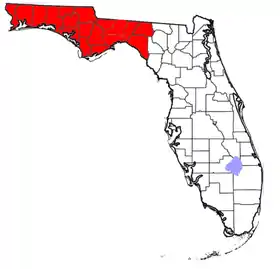 Kort med Florida Panhandle-regionen markeret i rød.
