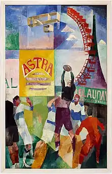 Der er lighed mellem Holdet fra Cardiff og Sofus header: den springende spiller og bolden i luften skyldes nok, at begge har brugt et pressefoto som forlæg, der er valgt på grund af det dramatiske højdepunkt. Lennart Gottlieb mener, at der er kunstnerisk forbindelse mellem de to malerier. Delaunays billede hylder den moderne tid med med dens nyskabelser som flyvemasker, Eiffeltårnet og pariserhjul, medens i Giersings billede er dramaet og bevægelsen i fodboldspillet der er omdrejningspunktet og de maleriske udladninger.[3]