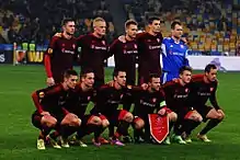 Spillere fra AaB før kamp i UEFA Europa League mod Dinamo Zagreb.