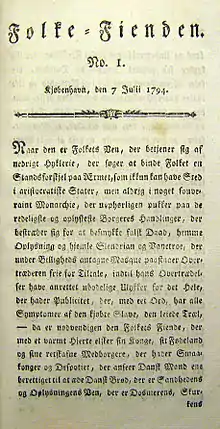 | Naar den er Folkets Ven, der betjener sig af nedrigt Hyklerie, der søger at binde Folket en Standsforskjel paa Ærmet, ... der uophørligt pukker paa de redeligste og oplyseste Borgeres Handlinger, der bestræber sig for at besmykke falsk Daad, hemme Oplysning og hjemle Slendrian og Vanetroe ... med eet Ord, har alle Symptomer af den kjøbte Slave, den leiede Træl - da er nødvendigen den Folkets Fiende, der med et varm Hjerte elsker sin Konge, sit Fødeland og sine retskafne Medborgere ... og da er Forfatteren af dette Blad Folkets dødeligste, Folkets uforsonligste Fiende, da skal ingen ivrigere bestræbe bsig for at vise det sit inderlige, sit ufogjengelige Fiendskab end han." | ||