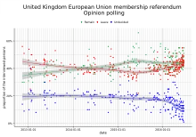 | 27.–29. maj | 42 % | 45 % | 15 % | 1004 | ICM Arkiveret 24. juni 2016 hos Wayback Machine | telefon | ellers identisk måling gennemført ved både telefon- og internetinterviews | ||