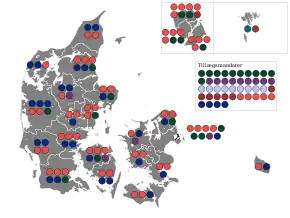 ![]() Mandaternes fordeling efter amts- og storkredse  | ||||||||||||||||||||||||||||||||||||||||||||||