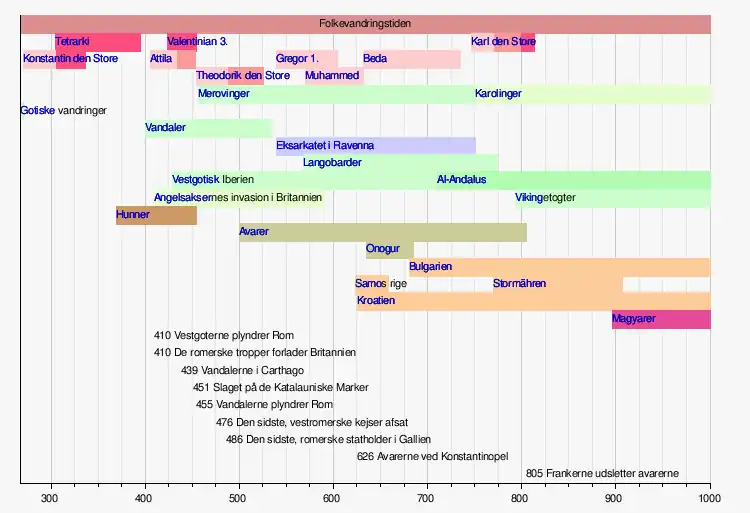 Tiden 400 e.Kr. - 1100 e.Kr. betegnes som helhed også som tidligste middelalder eller i ældre historiske fremstillinger som den mørke middelalder. I Skandinavien bruges betegnelsen germansk jernalder[1]. Folkegrupper sivede ind, hvor Romerriget svækkedes.