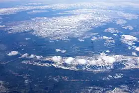 ![]() Fonnås-massivet i forgrunden, Jutulhogget midt i billedet. Udsigt mod vest. | |