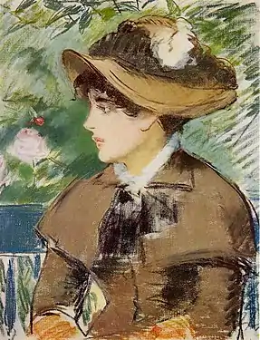 Manet har portrætteret hende flere gange, for eksempel som et brystportræt af en ung kvinde iført en pelerine, et kort skulderslag, Jeune femme à la pèlerine. På billedet i pastel Sur le Banc fra 1879 ('På bænken' / 'Kvinde på bænk', hos Pola, kunstmuseum i Hakone, Japan) vises hendes hoved som i Forår i profil mod en baggrund af planter[note 3].