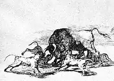 ![]() «Oksekamp» Etsning af Goya, 1816 |